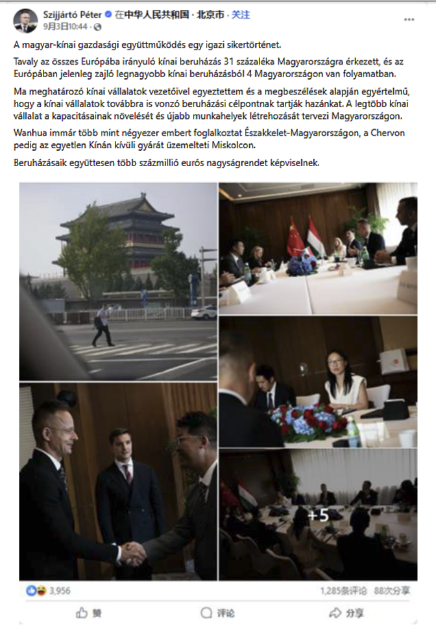 2025年9月3日,匈牙利外交與對外經(jīng)濟部長西雅爾多在北京參加完紀念中國人民抗日戰(zhàn)爭暨世界反法西斯戰(zhàn)爭勝利80周年閱兵活動后,同在匈牙利投資的中國主要公司領(lǐng)導(dǎo)人進行了會談。